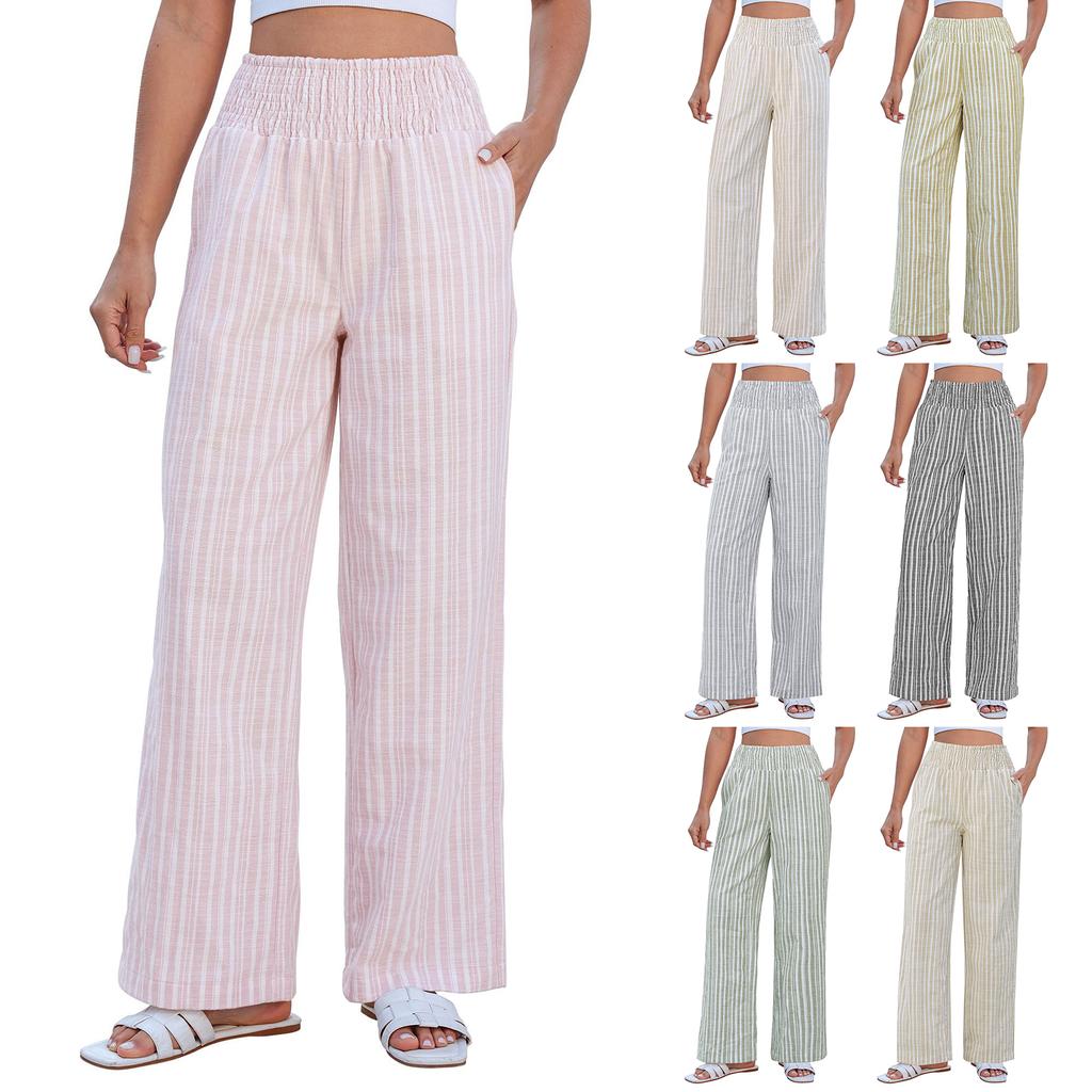 Ladies' Casual And Fashionable High Waist Wide Leg Striped Linen Pants