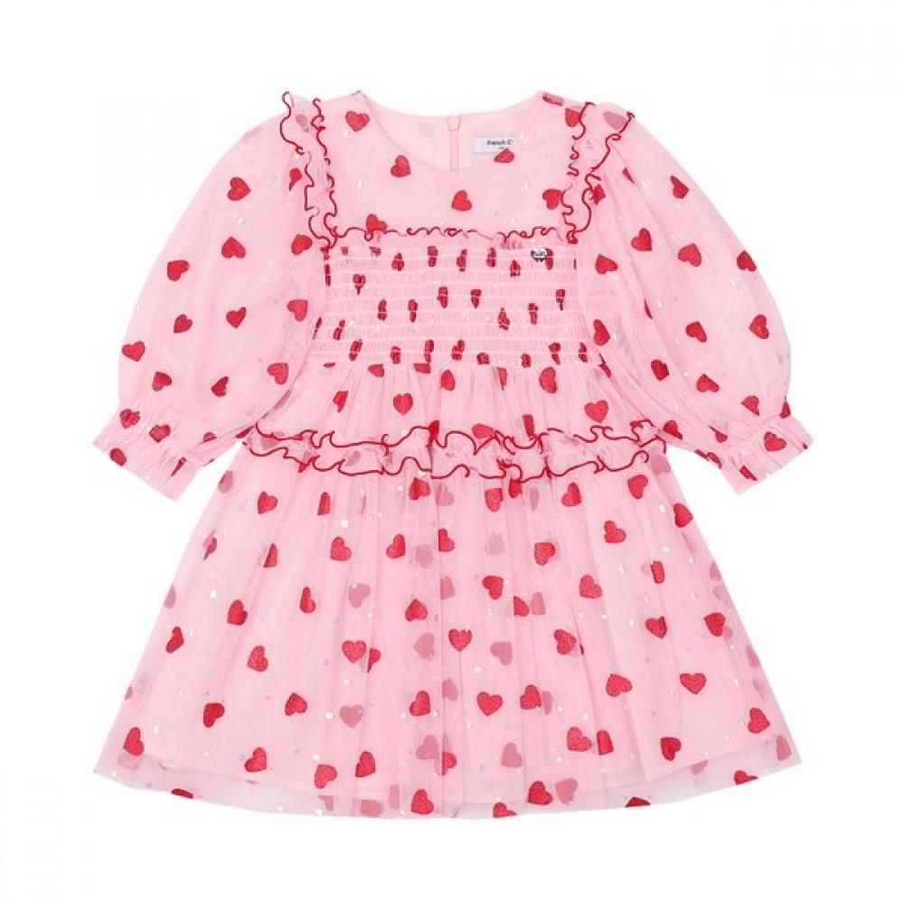 The Pink Heart Smocking Dress features lovely heart pearl details, with a bodice that is designed with smocking for a comfortable fit. The red interlock collar adds vibrancy, while the tiered style provides a full skirt with charming flair.