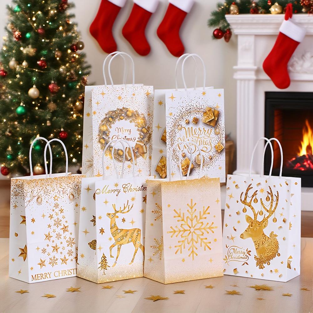 12/24pcs Elegant White &Golden Luxury Christmas Gift Bags with Golden Glitter Reindeer,Snowflake & Tree Cutouts Party Packaging