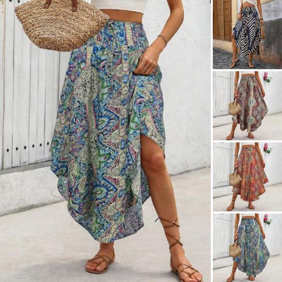 Boho Skirt Elastic High Waist Adjustable Lace-up A-Line Skirt Boho Retro Printed Loose Fit Slimming Skirt Work Leisure Travel Daily Wear