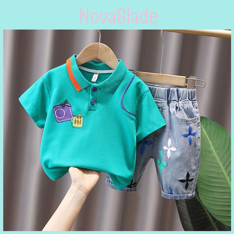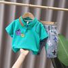 The short-sleeve polo shirt adds a touch of modern style, while the matching shorts provide ease of movement, allowing your child to run, jump, and play without restriction. The ensemble comes in two cheerful colorsclassic white and playful greeneach adorned with captivating cartoon designs that will surely become a favorite in their wardrobe. With sizes ranging from 80cm to 140cm, this outfit caters to various heights and ensures a perfect fit for every little adventurer.