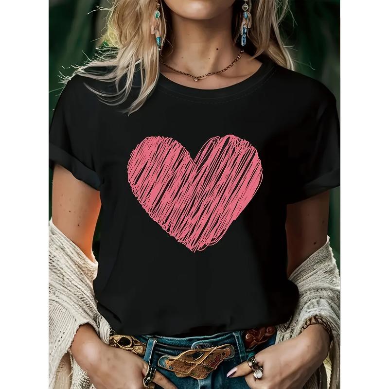 Plus Size, Pink Doodle Heart Graphic Print Plus Size Women's T-shirt, Short Sleeve Crew Neck Casual Top for Summer & Spring, Women's Clothing