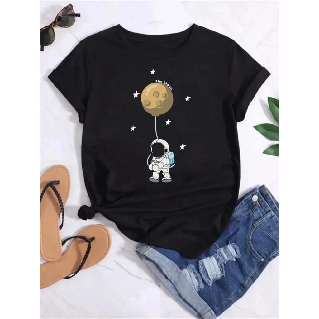 T Shirt Women Moon Planet Print Fashion Tee Shirts Casual Round Neck Short Sleeve Streetwear Female T-Shirt Vintage Tops 70304