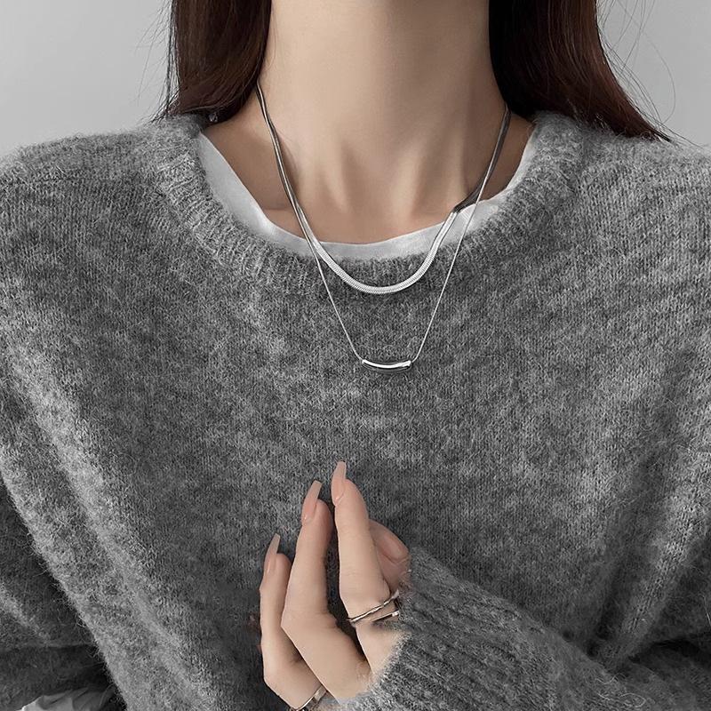 Silver Eggplant Double-Layer Stackable Necklace - Women's Trending Clavicle and Sweater Chain with Snake Bone Design.