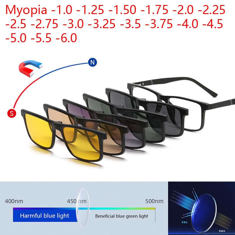 Prescription Transparent Grey Myopia -0.5 To -10 Square Frame Magnetic Sunglasses Blue Light Blocking Lens Anti-skid Booties