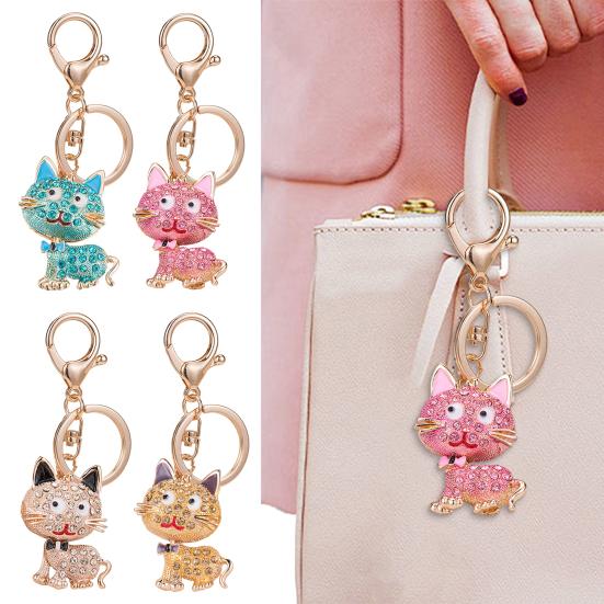 This exquisite cat-shaped keychain pendant features a durable alloy electroplated finish that ensures long-lasting color and resistance to fading. Adorned with firmly inlaid, colorful rhinestones in pink, gold, blue, and champagne hues, it sparkles brilliantly under light, framed by a luxurious golden alloy border for a high-end look.