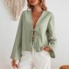Bu şık Kadın Gömlek ile gardırobunuza gündelik şıklığın bir dokunuşunu katın. Cazibe katan modaya uygun bağcıklı kapatma özelliğine sahip bu uzun kollu hırka, bol kesimli ve göğüs kısmında bağcıklı olarak tasarlanmıştır..